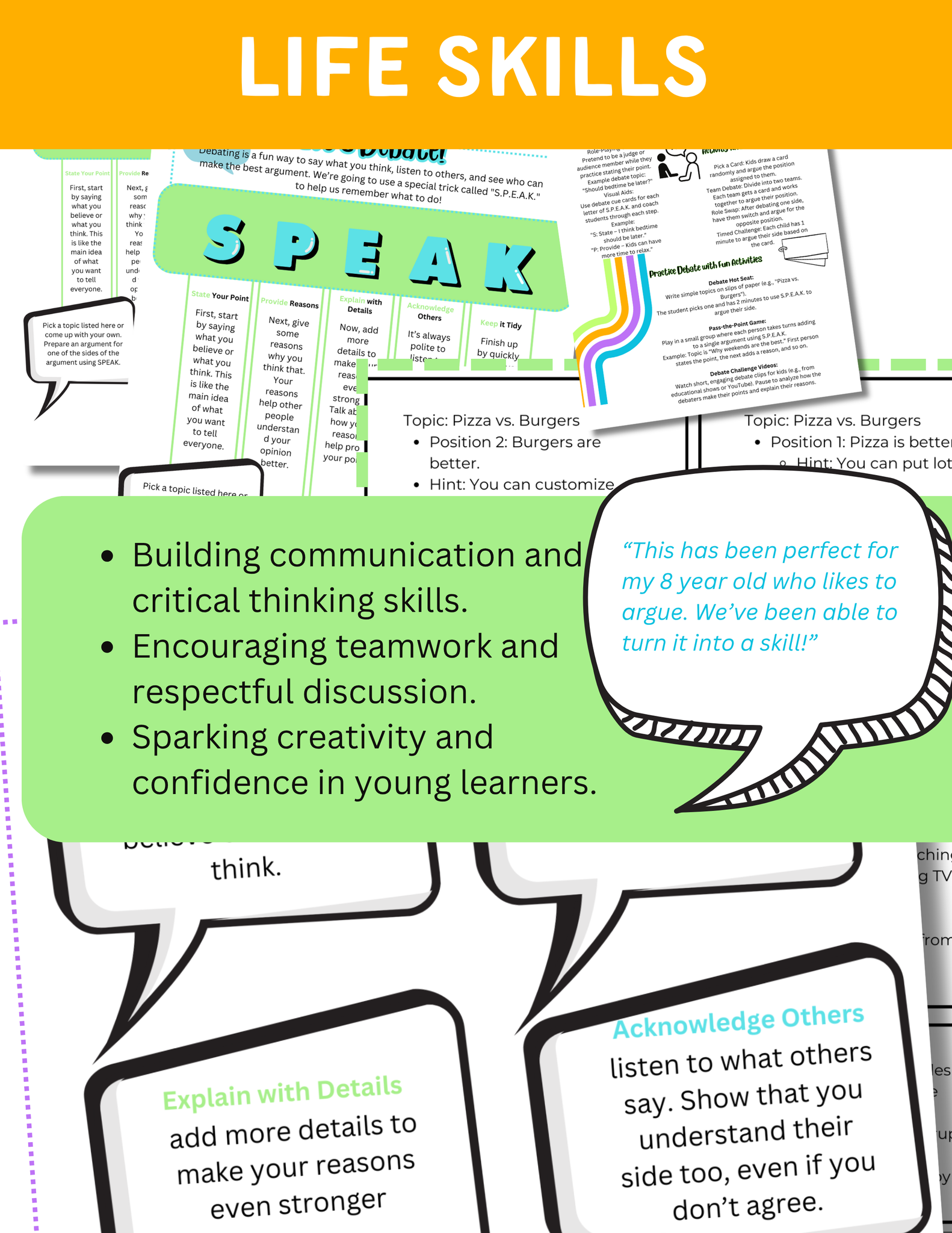 Make debating easy, fun, and engaging for kids with this S.P.E.A.K. Debate Toolkit! Perfect for homeschoolers, classrooms, or family game nights, this resource introduces children ages 6-10 to the art of debating using the simple, memorable "S.P.E.A.K." method: