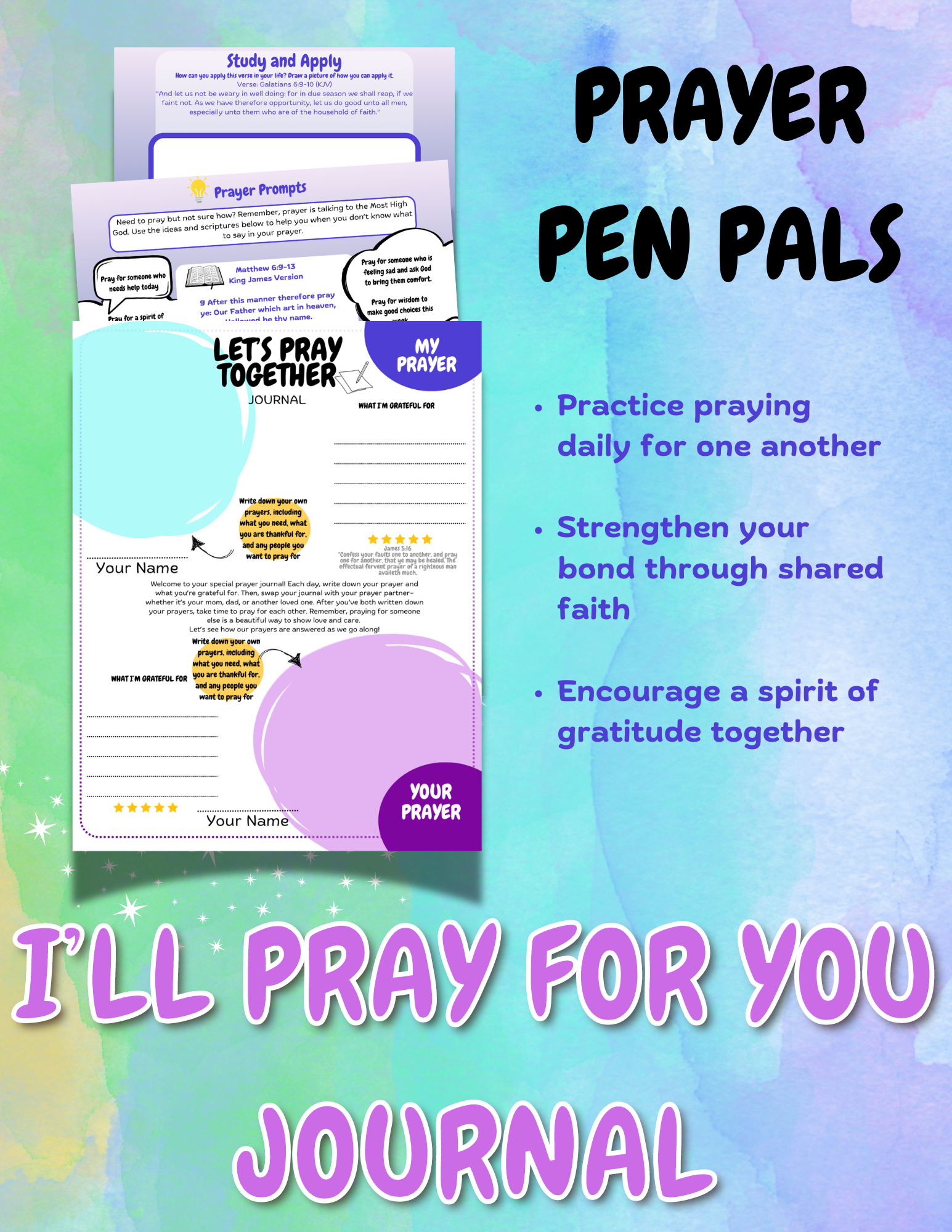 Foster a deeper connection with your child through the power of prayer with the 'I'll Pray for You Journal'. This interactive journal is designed to be shared between a parent and child, creating a special space where both can write their prayers, express gratitude, and support each other spiritually. Features prompts to guide meaningful prayer and reflection, along with a page for both the parent and child to share their prayers with each other.